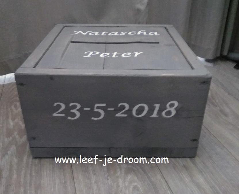 Deze enveloppenkist is gemaakt van nieuw onbehandeld steigerhout geverfd in licht grijs steigerlak en hand beschilderde namen en datum.