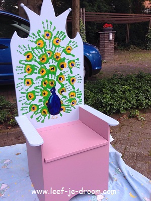 Kindertroon Floor die verhoogd en verbreed is. Deze Kindertroon ontwierp ik voor een school in Nijmegen, ook weer geschikt voor kleuters en iets grotere kinderen. Deze kindertroon Floor verbreed stuurde ik ongelakt op. De Leraren en kinderen van de basischool in Nijmegen wilde de Kindertroon zelf schilderen en vormgeven. Zie zelf het mooie resultaat van de pauw gemaakt van verschillende kleurige kinderhanden.