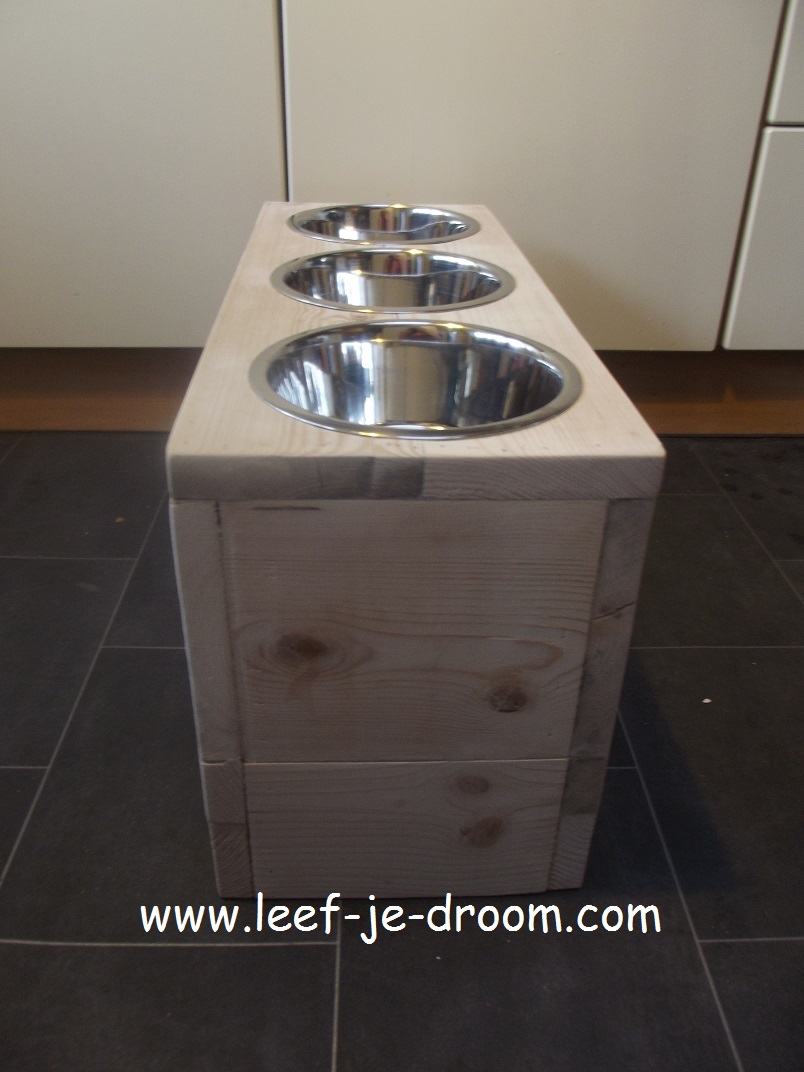 Deze steigerhouten voerbak heeft drie roestvrijstalen eetbakken van een doorsnee van +- 19/21cm.